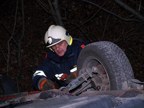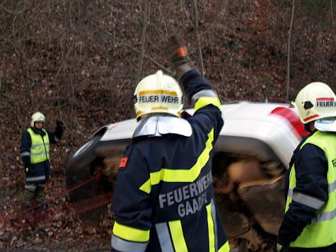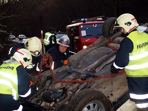 Das verunfallte Fahrzeug wurde mittels Kettenstrang und Seilwinde des Rüstlöschfahrzeuges der Freiwilligen Feuerwehr Gaaden aufgerichtet.