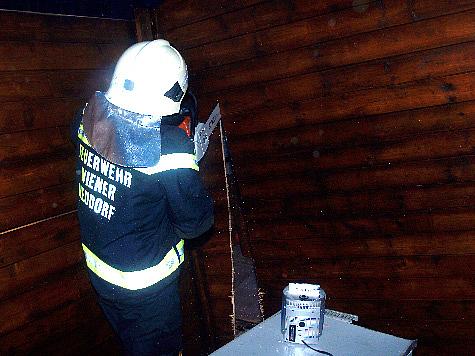 Auf einer Dachterasse in der Friedrich Schiller-Straße in Wr. Neudorf riss der Wind eine Gartenhütte um. Zuerst sicherten die Kräfte der FF Wr. Neudorf die Hütte mit einem Seil an der Hausmauer.