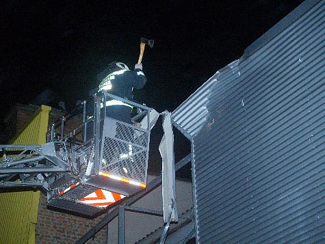 Kaum war dieser Einsatz beendet, wurde eine lose Blechwand im IZ NÖ, Straße 3 gemeldet. Teile einer Wellblechfassade lösten sich und drohten abzustürzen. Über die Drehleiter Wr. Neudorf wurden die losen Teile von der Wand getrennt und anschließend am Boden durch große Steine gesichert.