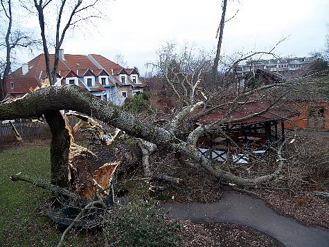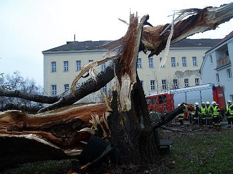 Der wohl spektakulärste Einsatz ereignete sich um 14:46 Uhr in Biedermannsdorf. Ein ca. 15 Meter hoher Baum stürzte im Parkgelände des Seniorenheimes Biedermannsdorf um und fiel dabei auf ein Pavillon. Zum Glück befand sich zu diesem Zeitpunkt kein Pensionist darin.