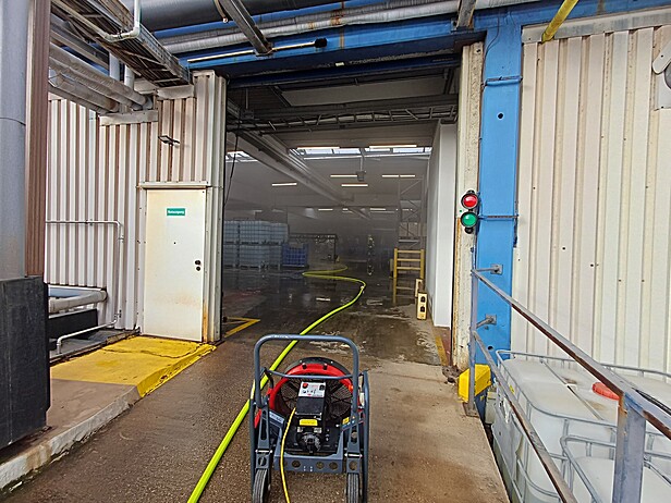 Der Atemschutztrupp ging mit einer C-Löschleitung vor. Mittels Sprühstrahl konnten die entstandenen Dämpfe niedergeschlagen werden. Zeitgleich kamen mehrere Belüftungsgeräte zum Einsatz. Nach kurzer Zeit zeigten die gesetzten Maßnahmen Wirkung. Der ebenfalls eingetroffene Schadstoffberatungsdienst kontrollierte gemeinsam mit der Firmenleitung die betroffene Halle und konnte eine weitere Gefährdung ausschließen.
