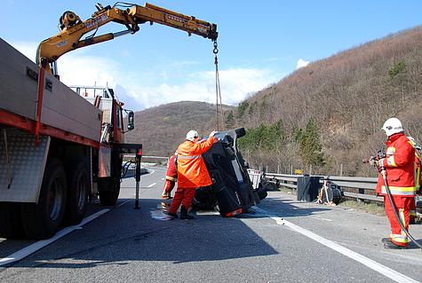 Durch das hohe Gewicht der Baggerlöffel und der Pendelbewegung des Anhängers wurde das Fahrzeug des Lenkers aus der Kontrolle gebracht und umgeschmissen. Der PKW kam am Dach liegend auf der ersten Spur zum Stillstand.