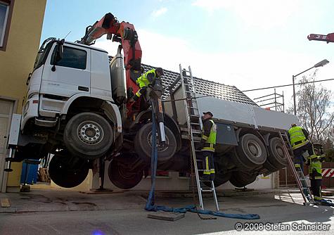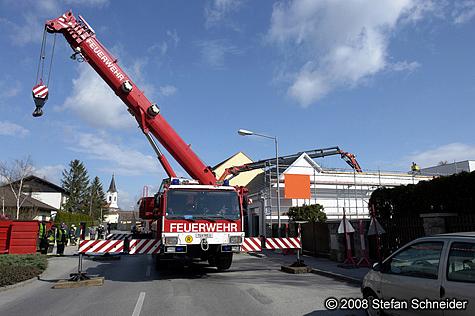 Mittels der Seilwinde des RLF-Tribuswinkel wurde gemeinsam mit dem Kranfahrzeug der verunfallte LKW wieder auf die Räder gestellt. Während der Bergungsarbeiten wurde der Ladekran des LKW aus eigener Kraft eingefahren, damit keine weiteren Schäden am Haus entstehen konnten.