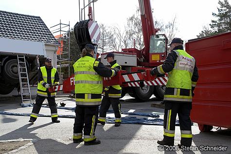 Damit die Anschlagmittel richtig angelegt werden konnten, mussten die Männer der FF-Mödling teilweise über Steckleiterteile arbeiten. Anschließend wurde die Lasttraverse am Kranfahrzeug montiert und die Endlosschlingen an dieser befestigt.