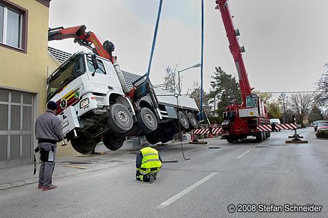 An der Einsatzstelle angekommen wurde das Kranfahrzeug richtig positioniert. Um den LKW zu bergen wurden am vorderen sowie am hinteren Teil des Fahrzeuges von den Einsatzkräften der Freiwilligen Feuerwehr Mödling sogenannte Endlosschlingen angebracht.