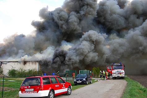 Um 12:46 Uhr wird die Feuerwehr Wiener Neudorf zu einem Brand in einer Lagerhalle gerufen. Schon auf der Anfahrt zum Einsatzort ist die Rauchsäule über dem Objekt sichtbar. Beim Eintreffen der Feuerwehr steht die 400m2 große Lagerhalle bereits in Vollbrand.