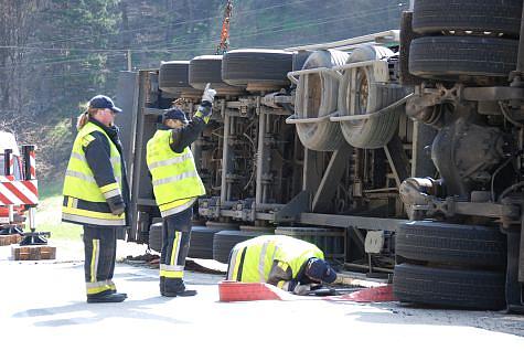 Unverzüglich setzten sich die Kameraden der Freiwilligen Feuerwehr Mödling mit dem Kran- und Wechselladefahrzeug in Bewegung. Am Unfallort angekommen, wurde nach der Lageerkundung durch den Kraneinsatzleiter LM Michael Schula entschlossen, den verunfallten LKW-Zug am Anhänger kurz anzuheben damit die Hebebänder in Stellung gebracht werden können.