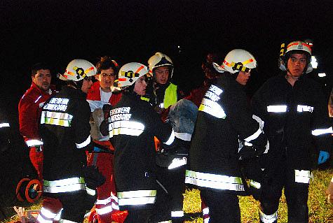 Gleichzeitig wurde ein Brandschutz beim verunfallten Fahrzeug aufgebaut. Zu diesem Zeitpunkt wurden bereits drei Personen vom Roten Kreuz versorgt. Plötzlich kam die Meldung, dass noch eine vierte Person vermisst werde. Unverzüglich begaben sich mehrer Trupps auf die Suche nach der vermissten Person. Auch mit Hilfe der Wärmebildkamera der Feuerwehr Vösendorf wurde gesucht.
