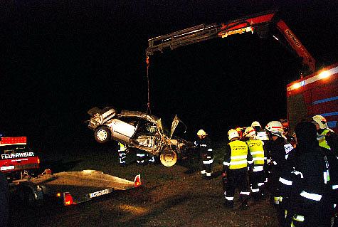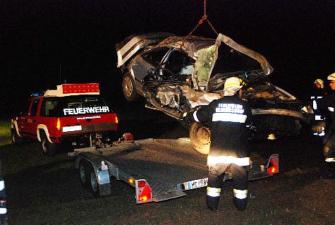 Zum Glück konnte die Suche nach Rücksprache mit einer verletzten Person eingestellt werden, da sich herausstelle, dass lediglich drei Personen im Fahrzeug waren. Die Bergung des verunfallten PKW wurde mit dem Ladekran des SRF-Vösendorf vorgenommen. Nachdem ein Kettenstrang am Auto angebracht wurde, konnte das Fahrzeug auf einen Autoanhänger verladen werden.