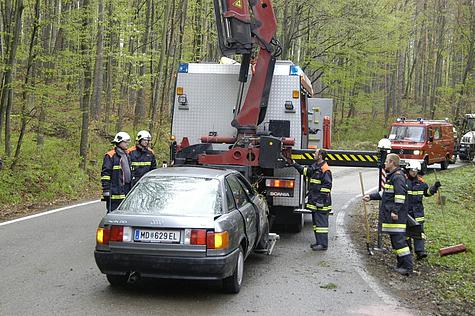 Die Fahrzeugbergung wurde mit dem Ladekran des schweren Rüstfahrzeuges Sittendorf durchgeführt. Anschließend wurde die Fahrbahn entsprechend gereinigt und das Unfallfahrzeug abtransporiert.