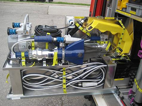 Neben der Normausstattung ist auch noch ein hydraulisches Kombigerät SC55 von der Firma Lukas, ein Rettungszylinder R430 3-stufig, ein elektrisches Kompaktaggregat sowie vier Rangierroller Gojak 6200 eingebaut.