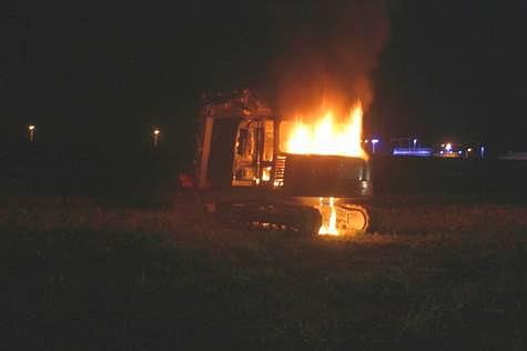 Schön während der Anfahrt zum Einsatzort war der helle Lichtschein des Brandes zu sehen. Unbekannte Täter setzten aus bislang unbekannter Ursache einen Löffelbagger an einer Baustelle nähe dem Kreisverkehr Schönbrunner Allee – Vösendorfer Nordspange in Brand. Binnen kürzester Zeit rückten die Einsatzkräfte der Feuerwehr Vösendorf zur Einsatzstelle aus.