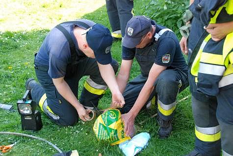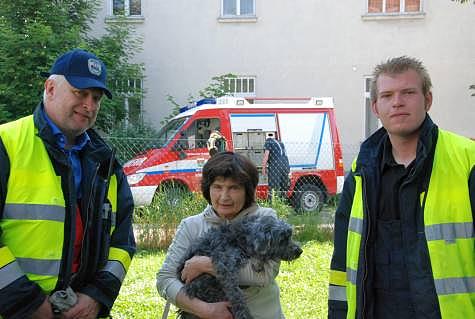 Durch den Kropf welcher mit den Handtüchern am Ende des Stahlseiles gebildet wurde musste sich der Tibetterrier in dem Rohr hinunter bewegen. Im Keller des Hauses streckte bereits Feuerwehrmann Alexander Hahn seine Hand Cleo entgegen um den Hund retten zu können.