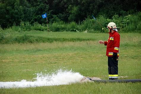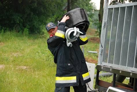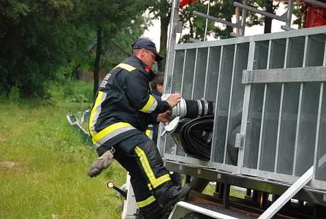 Nach dem Verlegen von einer Doppelleitung mit A-Druckschläuchen auf einer Länge von ca. 200 m wurde die Hochleistungspumpe beim mittleren Teich in Stellung gebracht.