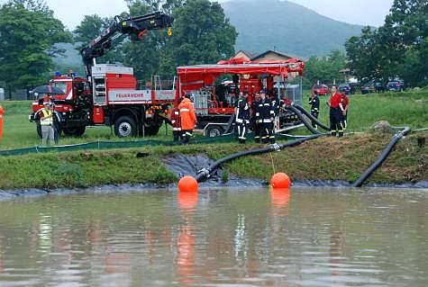 Ebenfalls mit einer Doppelleitung A-Saugschläuchen wurden 19.000 l pro Minute aus dem Beregnungsbecken gepumpt. Der Einsatz der Hochleistungspumpe zeigte Erfolg und der Teich konnte gegen das Abrutschen gesichert werden. Insgesamt wurden ca. 2 Mio. Liter Wasser ausgepumpt. Bezirksfeuerwehrkommandant LFR Franz Koternetz machte sich persönlich ein Bild von der Lage am Richardshof.
