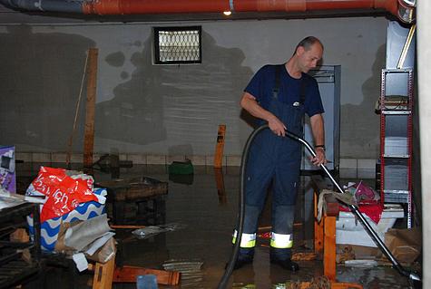 Über das Kellerfenster drang das Wasser vom Berghang ein und überflutete den gesamten Keller teilweise 1 m hoch. Mit Unterwasserpumpen wurde das Wasser aus dem Keller gepumpt. Die restlichen Regenmassen wurde mit einem WAP-Sauger aus dem Haus befördert.