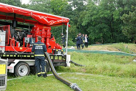 Neben der stationierten Hochleistungspumpe bei der Feuerwehr Brunn wurde auch die Pumpe Achau zum Einsatzort alarmiert. Die Kameraden der Feuerwehr Brunn am Gebirge brachten die Hochleistungspumpe beim 3. Teich und die Kameraden der Feuerwehr Achau die Pumpe beim 4. Teich in Stellung.