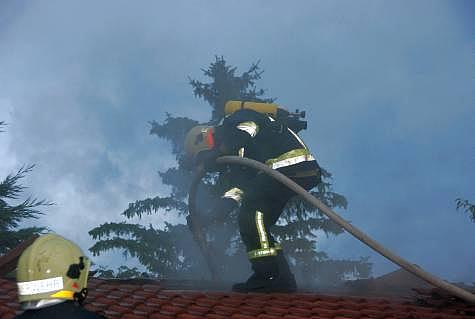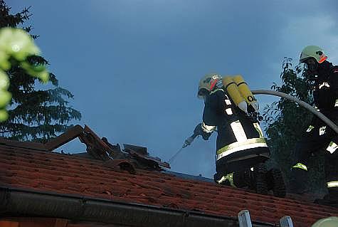 Ein zweiter Atemschutztrupp begab sich zur Erkundung auf das Dach der Gartenhütte. Beim Entfernen des ersten Dachziegel drangen auch schon die Flammen heraus.