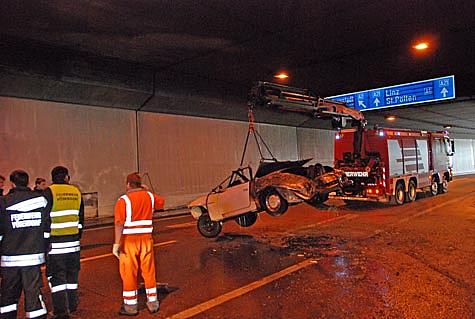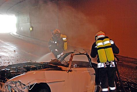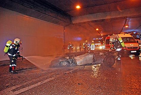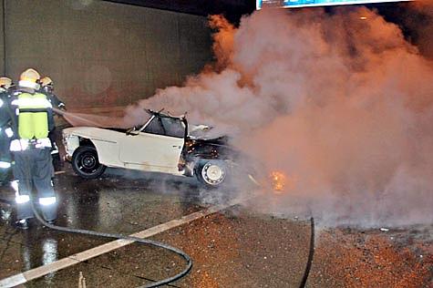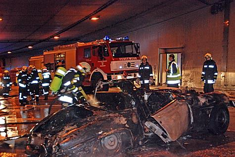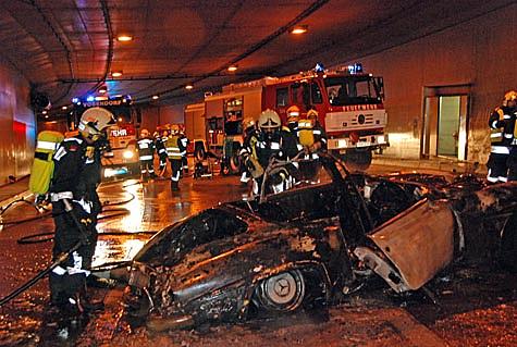 Auf der Außenring-Schnellstraße S1 in Fahrtrichtung Wien ging am Samstag Vormittag des 26. Juli 2008 ein Mercedes-Oldtimer im Tunnel Vösendorf in Vollbrand auf.