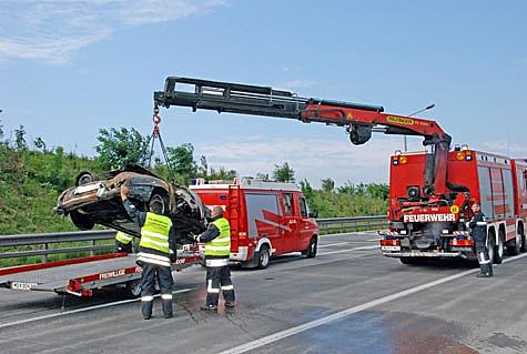 Der ausgebrannte Oldtimer wurde mit dem Ladekran des SRF Vösendorf aus dem Tunnel Vösendorf gebracht. Außerhalb des Tunnels wurde das Fahrzeug auf den Abschleppanhänger der Freiwilligen Feuerwehr Vösendorf verladen und von der S1 entfernt.