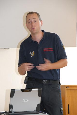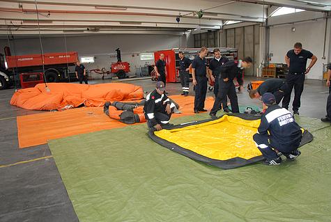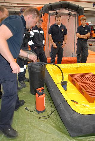 Nach einer theoretischen Schulung durch FT Ing. Michael Bruckmüller (FF Breitenfurt) wurde im Anschluß durch V Christian Vlach (FF Perchtoldsdorf) die neue WUS/DEKO Einheit (Wechsellader Umweltschutz/Dekontamination) präsentiert.