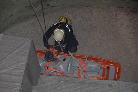 Bei der letzten Station verunglückten zwei Arbeiter in einem 16 Meter tiefen Schacht. Über den Ladekran eines SRF wurde die Rettung der Personen ermöglicht. Bevor jedoch die Rettung durchfürbar war musste ein Atemschutztrupp durch die Öffnung mit zirka 8 Meter Durchmesser hinabsteigen.