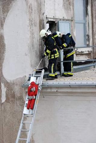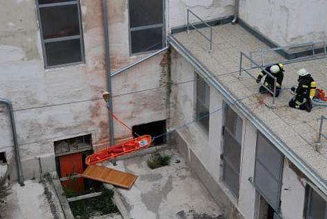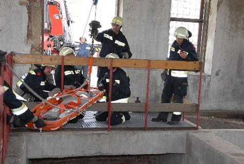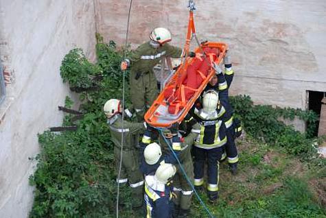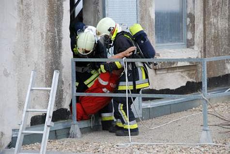 Über eine vierteilige Steckleiter begab sich ein Atemschutztrupp auf ein zirka 7 Meter hohes Zwischendach um dort eine weitere dreiteilige Steckleiter für das Dach aufzustellen. Währenddessen wurde ein Greifzug in Stellung gebracht um eine schonungsvolle Rettung der verletzten Personen über eine Trage zu ermöglichen.
