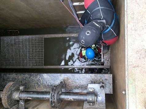 NÖ Landesfeuerwehkommandant KommR Josef Buchta erteilte nach Absprache mit dem örtlichen Kommandanten HBI Alfred Grössl und dem Einsatzleiter der Tauchgruppe Süd LM Mag. Alexander Bauer den Einsatzbefehl. Zwei Teams bestehend aus jeweils einem Taucher mit einem Leinenmann waren im Einsatz. Aufgrund der ausgesprochen schlechten Sichtverhältnisse von nur fünf Zentimetern und der Gefahr durch die nicht vollständig geschlossene Schleuse mussten die Männer angeleint und mit Helm an die Ausräumarbeiten gehen. Im etwas mehr als zwei Meter tiefen Wasser konnten die Taucher nach 40 Minuten Holz aus der Führungsschiene der Schleuse sowie Schlamm aus der Dichtungsschiene entfernen und den Einsatz erfolgreich beenden.