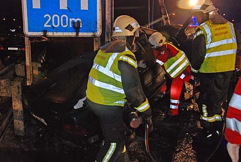Die Bezirksalarmzentrale Mödling alarmierte einen Zug der Freiwilligen Feuerwehr Wiener Neudorf um 3:22 Uhr zur Menschenrettung auf die Autobahn. Beim Eintreffen des Voraus Wiener Neudorf befand sich das Auto genau zwischen der Autobahn bzw. der Auffahrt. Wobei die Fahrerseite des Unfallfahrzeuges gegen die Lärmschutzwand gedrückt wurde. Sofort wurde mit der Menschenrettung begonnen. Zuerst wurde die Beifahrertüre mit dem hydraulischen Rettungsspreizer geöffnet und entfernt. In weiterer Folge wurde auch die hintere Fahrzeugtüre entnommen damit das Rote Kreuz einen besseren Zugang zum Verletzten hatte. Nach rund 20 Minuten war die eingeklemmte Person durch die Einsatzkräfte der Freiwilligen Feuerwehr Wiener Neudorf aus dem Unfallfahrzeug befreit. Leider konnte der Notarzt nur mehr den Tod feststellen. Das verunfallte Fahrzeuge wurde mit dem Ladekran des SRF Wiener Neudorf auf die Autobahn gehoben ehe es abtransportiert wurde. Während der Rettungsarbeiten war die Auffahrt Altmannsdorf gesperrt. Nach über einer Stunde konnten die 21 Mann mit deren 4 Fahrzeugen wieder ins Feuerwehrhaus einrücken.Bildautor: Herbert Wimmer/Pressestelle BFK Mödling