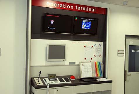 Beim Eintreten in das neue Feuerwehrhaus fällt sofort der „operation terminal“ auf! Dieser dient mit Ampelregelung für eine schnelle und effiziente Einsatzannahme und Einsatzquittierung. Ein zweiter Operation Terminal befindet sich in der Garderobe beim Ausgang zur Fahrzeughalle.
