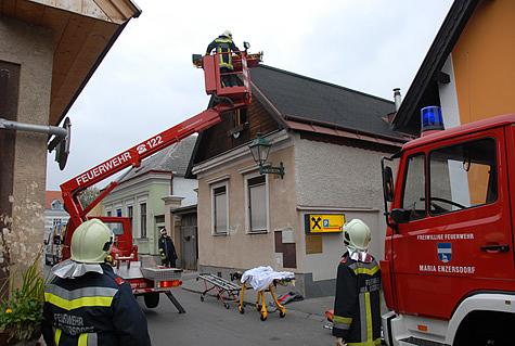 Das Unglück passierte im ersten Stock eines alten Hauses. Eine Rettung der Person durch das Stiegenhaus war unmöglich. Daher wurde um 8 Uhr 47 die Freiwillige Feuerwehr Maria Enzersdorf mit dem Steig zur Menschenrettung alarmiert. Unverzüglich setzten sich die ersten Einsatzkräfte in Bewegung.