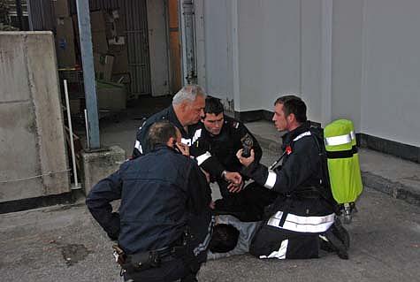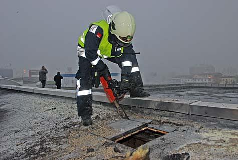 Erst um 15 Uhr 26 konnte der Brand lokalisiert werden und erste Einsatzmaßnahmen getroffen werden. Ein Atemschutztrupp begab sich sofort auf das Dach der SCS. Im Stiegenhaus begegnete ihnen der Arbeiter, der versucht hatte den Brand zu löschen. Dieser war offensichtlich körperlich geschwächt und zeigte Anzeichen einer Rauchgasvergiftung. Umgehend begab sich der Atemschutztrupp mit dem Arbeiter ins Freie. Gleichzeitig wurde das Rote Kreuz verständigt.