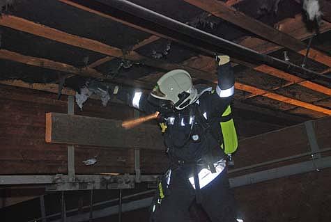 Währenddessen wurde der Brand dank der Sprinkelanlage großräumig eingedämmt. Die Wärmebildkamera zeigte aber eine enorme Erhitzung des Daches. Ein weiterer Atemschutztrupp der Feuerwehr Vösendorf öffnete die Zwischendecke und konnte Glutnester feststellen. Mit einem C-Rohr wurden diese gekühlt und abgelöscht. Zeitgleich verlor der Arbeiter sein Bewusstsein. Weil die Rettung noch nicht eingetroffen war, versorgten die Einsatzkräfte der FF-Vösendorf den Arbeiter mit einen Atemschutzgerät mit Frischluft und legten ihn in die stabile Seitenlage.