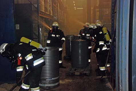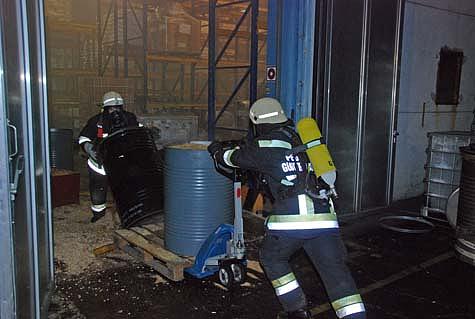Da zu diesem Zeitpunkt noch völlig unklar war um welchen Stoff es sich handelt, wurde eine Nachalarmierung veranlasst. Inzwischen begab sich ein Atemschutztrupp zur Erkundung in die Lagerhalle vor.