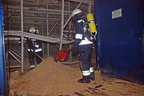 Die Flüssigkeit reagierte mit dem Bindemittel und setzte Dämpfe frei. Einsatzleiter BR Robert Moser entschied daher, dass das Bindemittel in Alufässer geschaufelt wird. Da über 1.000 Liter Äthanolamin ausgelaufen sind, wurde ein zweiter Atemschutztrupp in das Objekt geschickt.