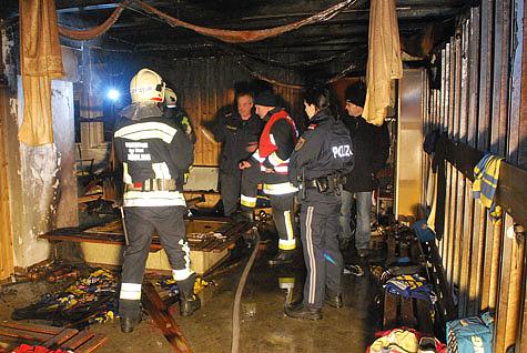 Durch die anwesende Polizei begann die Aufnahme der Brandursachenermittlung; auch das Rote Kreuz war mit zwei Fahrzeugbesatzungen in Bereitstellung.