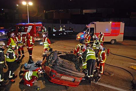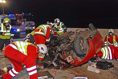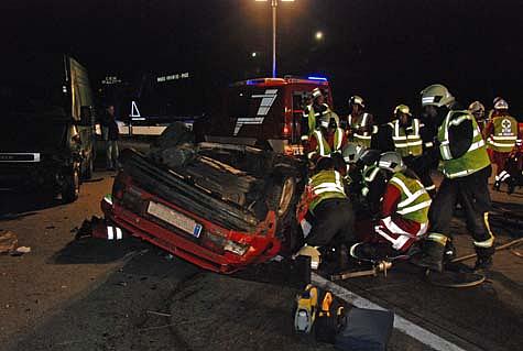 Das Fahrzeug, dass am schlimmsten von dem Unfall betroffen war, kam am Dach liegend zwischen 3. und 4. Fahrspur zum Stillstand. Der Lenker des Autos wurde dabei in seinem Fahrzeug eingeklemmt.
