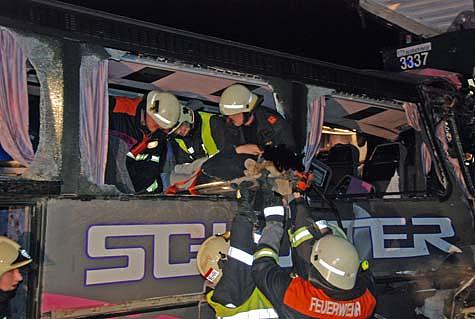 Über Schaufel- und Krankentragen wurden die Personen aus dem Fenster hinausgehoben und an die wartenden Einsatzmannschaften übergeben. Nach rund einer Stunde konnte die letzte eingeklemmte Person aus dem Reisbus befreit werden.