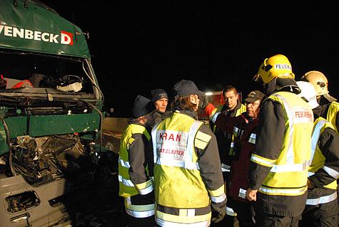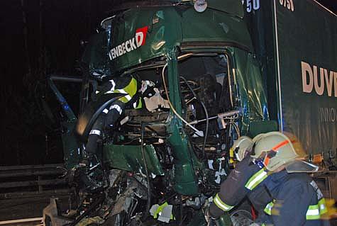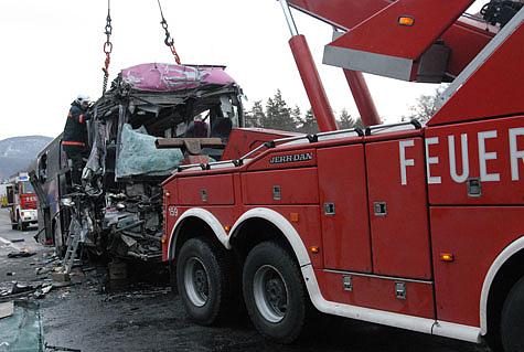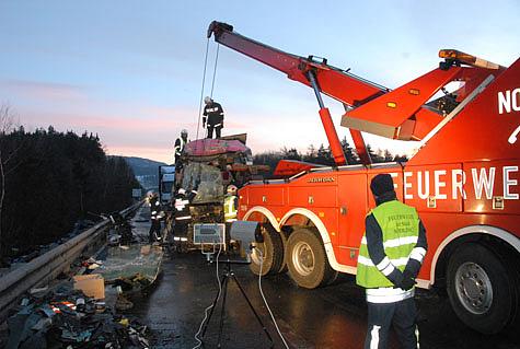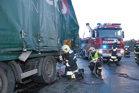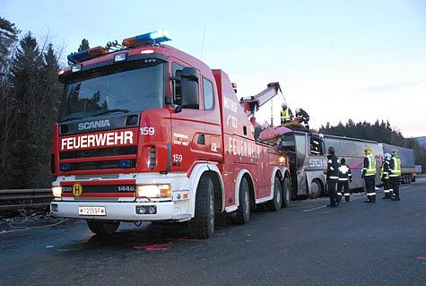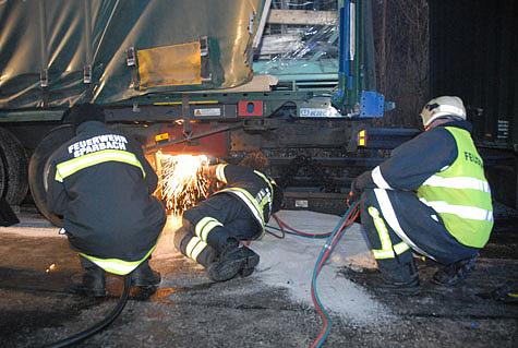 Der LKW-Zug in den der Reisebus krachte war derart stark deformiert, dass die Anhängevorrichtung von der Freiwilligen Feuerwehr mit einem Schneidbrenner aus dem Werkstättenfahrzeug der Berufsfeuerwehr abgeschnitten werden musste.