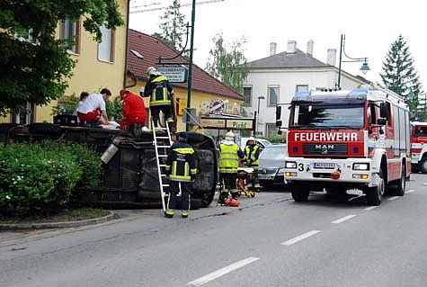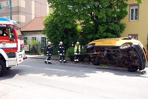 Feuerwehr und Rettung konnten so den verletzten Fahrer gemeinsam vom Auto herunter heben und ihn ins Krankenhaus bringen. Nach der Unfallaufnahme durch die Polizei wurde der Lieferwagen mit der Seilwinde des RLF zuerst aus dem Grünstreifen gezogen und anschließend aufgestellt.
