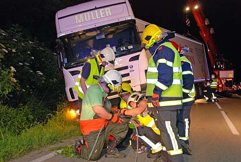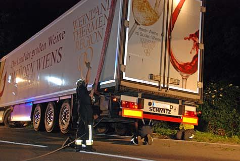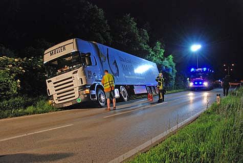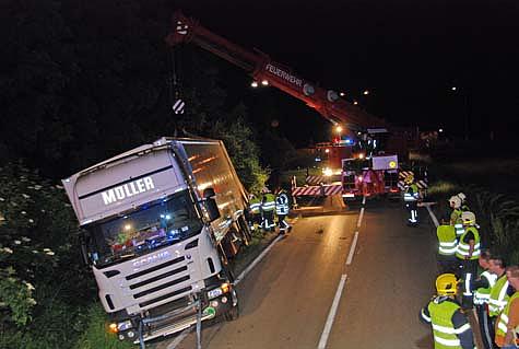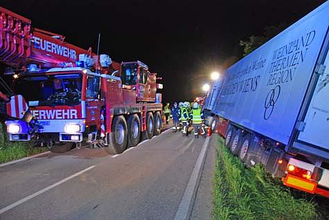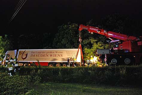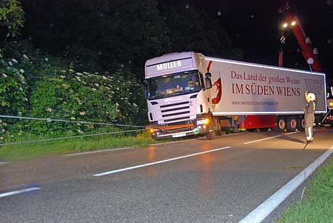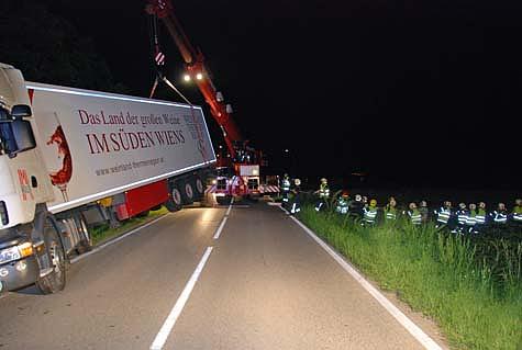 Auf der Umfahrungsstraße von Biedermannsdorf geriet in der Nacht vom 7. Juni 2010 ein Sattelschlepper von der Fahrbahn ab.