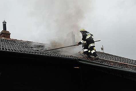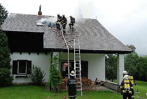 Inzwischen wurde ein umfangreicher Außenangriff an drei verschiedenen Stellen des Hauses durchgeführt. Ein Trupp der Feuerwehr Sittendorf begab sich über Steckleitern auf das Dach um den Brand direkt bekämpfen zu können.