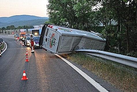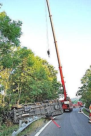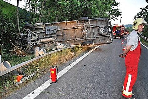 Umgestürzter Klein-LKW hängt über Leitschiene