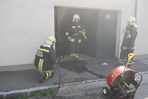 Ein Atemschutztrupp begab sich sofort mit einem HD Rohr in das Innere der Garage und begann mit den Löschmaßnahmen.