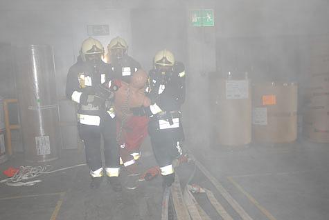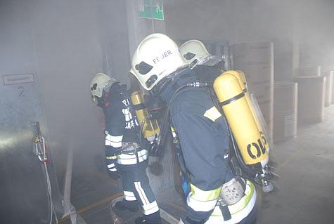 Der erste Atemschutztrupp folgte der bereits gelegten Löschleitung in das Obergeschoß des Gebäudes. Im hinteren Bereich der Halle befand sich ein separater Brandabschnitt in dem die vier Personen vermisst wurden. Nach dem Öffnen der Brandschutztür war für den Atemschutztrupp klar: Sicht quasi null, einzig und allein vorantasten die einzige Möglichkeit sich zu orientieren.