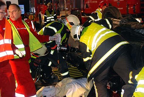 Es wurde mit der Menschenrettung über die Fahrerseite begonnen. Mit einem hydraulischen Rettungssatz konnte die Türe zwar schnell geöffnet werden, jedoch konnte die Person durch die starke Deformierung des Fahrzeuges nicht sofort befreit werden.