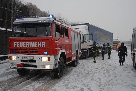 Parallel zu dem Verkehrschaos auf der A 21 musste das Kranfahrzeug Mödling auf die Südautobahn in den Bezirk Baden zu einer LKW Bergung alarmiert werden.