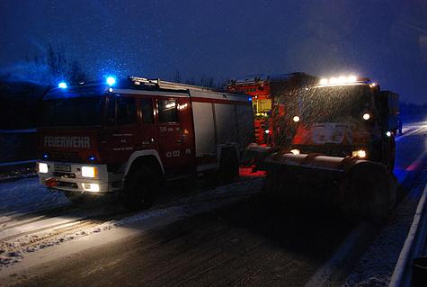 Durch Streifenwagen der Polizei wurden die Feuerwehreinsatzkräfte auf die Autobahn gegen die Fahrtrichtung geleitet.