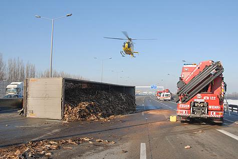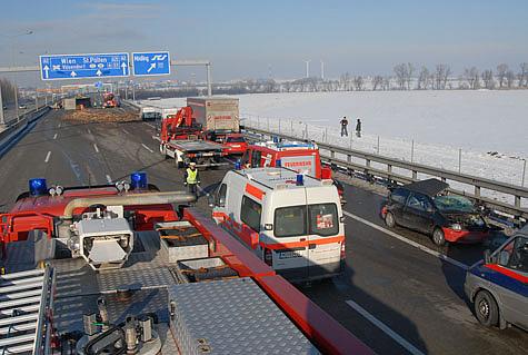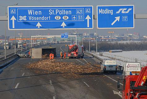 Am 20. Dezember ereignete sich auf der Autobahn A 2 bei Wr. Neudorf ein folgenschwerer Verkehrsunfall mit einem Lkw und mehreren Pkws. Ein Sattelzug, beladen mit Holzhackschnitzel, war Richtung Wien unterwegs, als es aus ungeklärter Ursache zu einem Zusammenstoß mit einem Pkw kam.