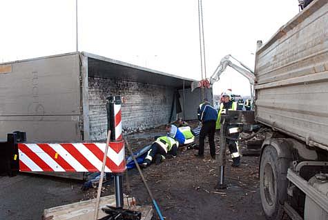 Nach langem und zähen Umladen auf andere Firmen LKWs konnte nach über 4 Stunden mit der Bergung des umgekippten Lastwagens begonnen werden. Kettengehänge wurden am leeren Anhänger montiert um mit der Bergung beginnen zu können. Langsam und behutsam stellte das Kranfahrzeug der FF Mödling den LKW wieder auf die Räder.